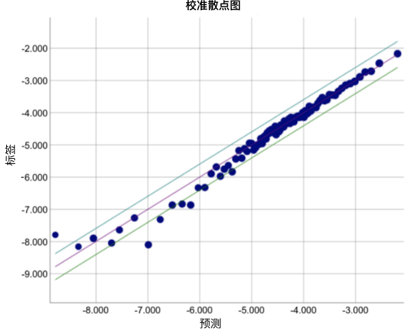 请查看以下某个特定模型的校准曲线。每个点表示包含 1000 个值的分桶。两个轴具有以下含义: