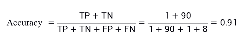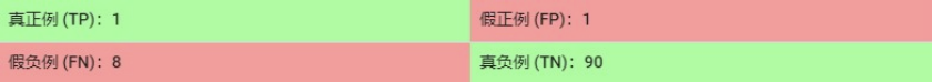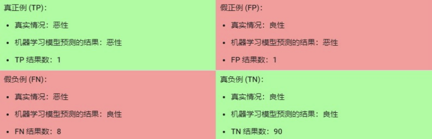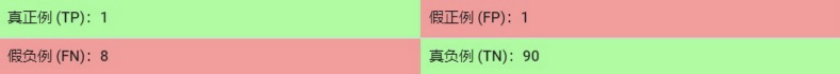在 100 个肿瘤样本中,91 个为良性(90 个 TN 和 1 个 FP),9 个为恶性(1 个 TP 和 8 个 FN)。