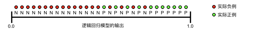 图 5. 曲线下面积(ROC 曲线下面积)曲线下面积对所有可能的分类阈值的效果进行综合衡量。曲线下面积的一种解读方式是看作模型将某个随机正类别样本排列在某个随机负类别样本之上的概率。以下面的样本为例,逻辑回归预测从左到右以升序排列: