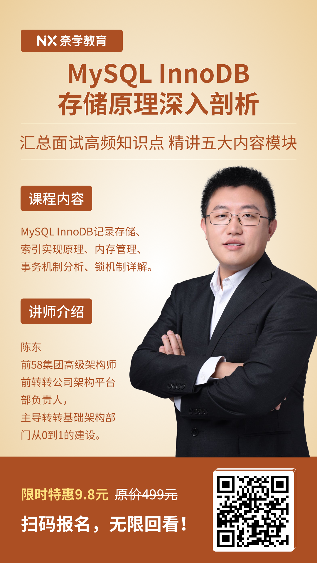 内容包括了MySQL默认存储引擎InnoDB的记录存储、索引、内存管理、事务、锁五大模块,讲师将带你深度剖析MySQL InnoDB 存储引擎实现原理,结合面试讲解那些平时使用数据库时高频出现的知识点,并通过实践跟你探讨相关的问题。