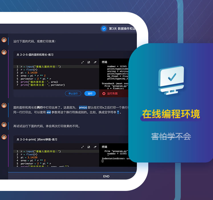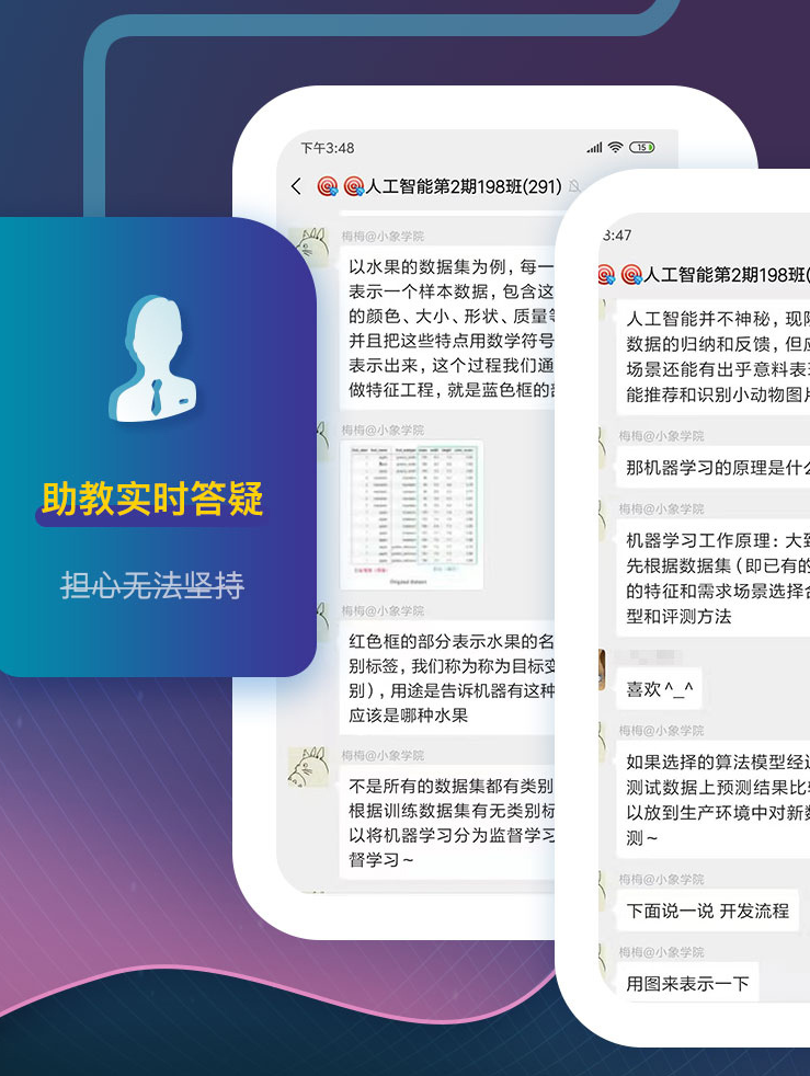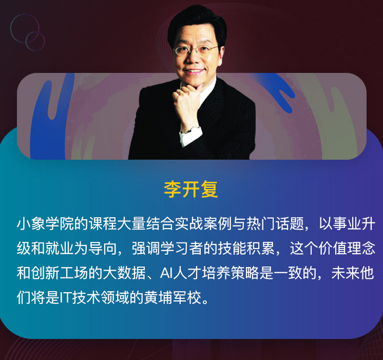 教研团队的专业老师,来自知名互联网IT企业,5年+教学经验培养10000名+大数据分析人才,专业值得信赖!不同于一个老师对多个学生的传统视频课堂,小象学院「0基础学Python」7天小课用最适合0基础的学员的交互学习。老师会把难懂的编程专业语言和规则,逐词、逐句的讲透,轻松理解,高效学习。而且专门为0基础学员设计的趣味练习题,能够马上结合实际学习内容做到学以致用。上课学习,无需安装任何软件,任何型号电脑打开浏览器,10秒钟就能进入编程页面开始学习,操作简单中学生都能一教就会。成功报名后,会助教老师线上社群训练营,实时在线指导解答讲解,为你扫清学习障碍。小象学院「0基础学Python」7天小课,非常适合在学习和工作中需要面对大量信息资料,分析海量数据的职场人。比如:财务、设计、运营、策划、销售、HR、金融从业人员、电商从业人员、大学生、创业者等。小象学院开设AI就业班,覆盖计算机视觉、自然语言处理、推荐与预测、金融与风控四大专业方向,培养AI高端技术人才。获得李开复创新工场战略投资,未来将是IT技术领域的黄埔军校。
