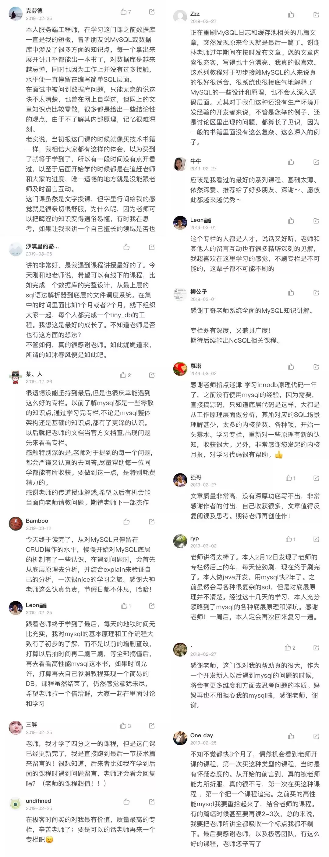 认真跟下来,感觉收获很大。这是一个可以长期影响你的专栏:从原理到思维再到实战,是我见过最全面、性价比最高的 MySQL 教程。