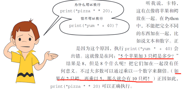 小卡特很困惑,“为什么 Python 可以执行 print("pizza"*20) ,而不能执行 print(“pizza”+20)?”