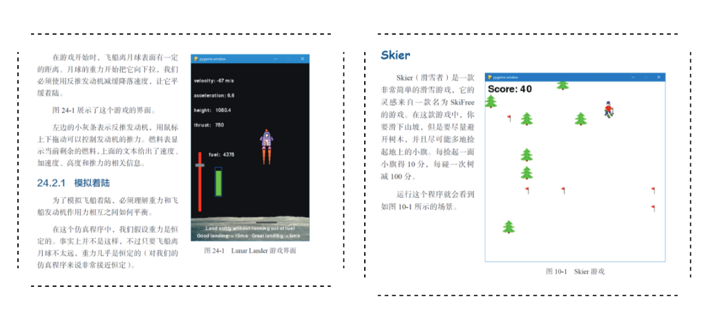 对于初学者来说,纯粹的数学计算并不是那么有趣,而能够做出一个看得到的东西,则是一件很有成就感的事情。因此,作者在书中早早引入图形用户界面(GUI)以保持新鲜感。在章节间穿插了各种游戏,并且提供了运行代码。比如第10章中的滑雪游戏、第16章中的沙滩球游戏、第19章中的PyPong游戏、第22章中的Hangman游戏等,初学者可以尝试自己输入这些代码,体验编程带来的成就感,从而增加学习主动性。