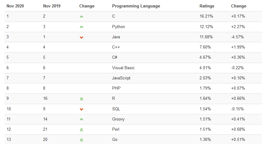 2020年11月 Tiobe 编程语言排行榜出炉了,Python在经历了数年的追赶之后,终于成功超过Java,成为了编程语言排行榜中的第二名!这真的是让我们Pythoner扬眉吐气了一把!