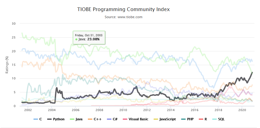 要知道,C和Java霸榜前两名已经将近20年的时间了。终于,新时代的王者Python,势不可挡地冉冉升起。这不是Python自己的胜利,这标志着一个时代的到来!相信要不了几年,Python同样会超过C,登顶编程语言排行榜。