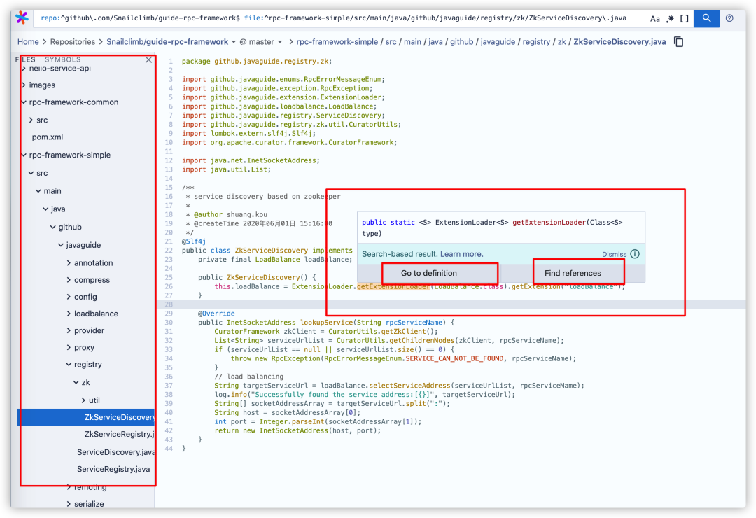 使用 SourceGraph 阅读代码的就像下面这样,同样是树形结构展示代码,但是我个人感觉没有 Octotree 的手感舒服。不过,SourceGraph 内置了很多插件,而且还支持类之间的跳转!