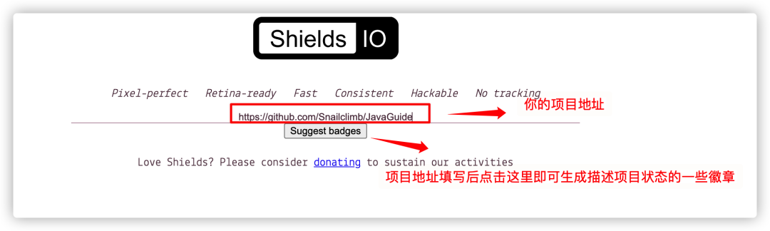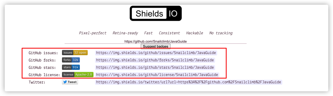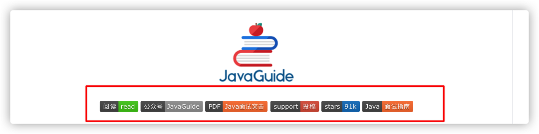 你在 Github 上看到的项目徽章都是通过 https://shields.io/ 这个网站生成的。我的 JavaGuide 这个项目的徽章如下图所示。