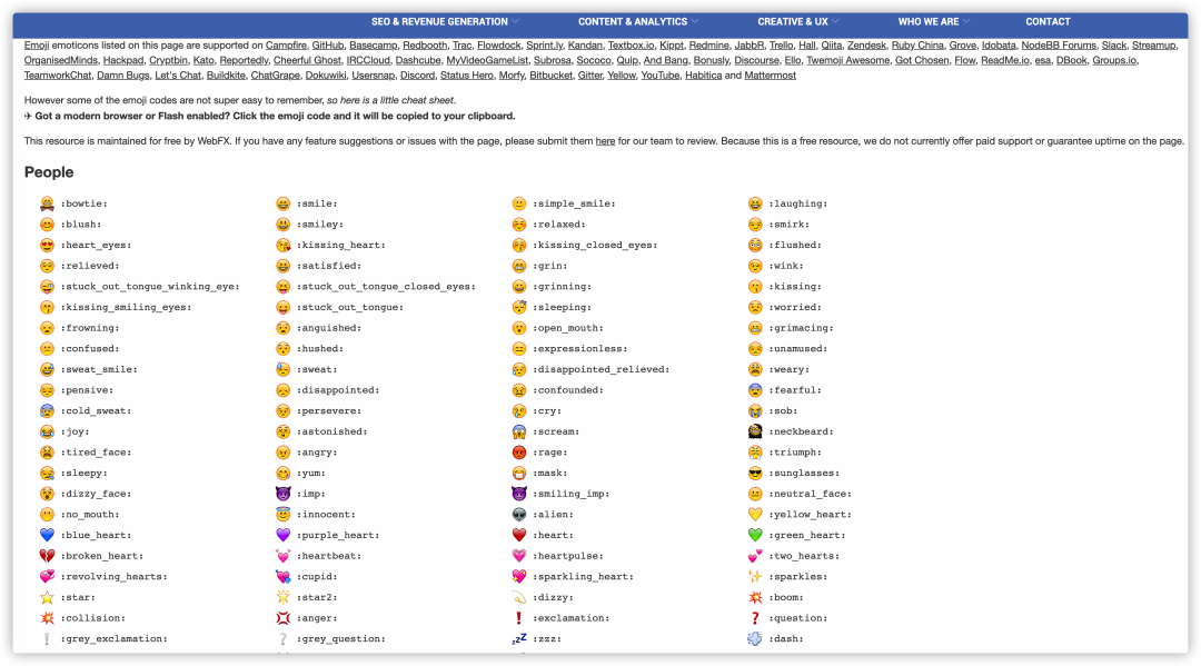 Github表情如果你想要在 Github 使用表情的话,可以在这里找找 :www.webfx.com/tools/emoji-cheat-sheet/ 。