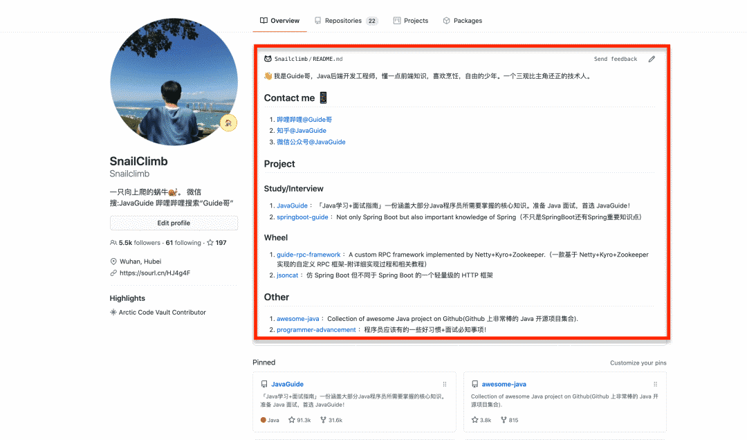 个性化首页展示效果想要做到这样非常简单,你只需要创建一个和你的 Github 账户同名的仓库,然后自定义README.md的内容即可。