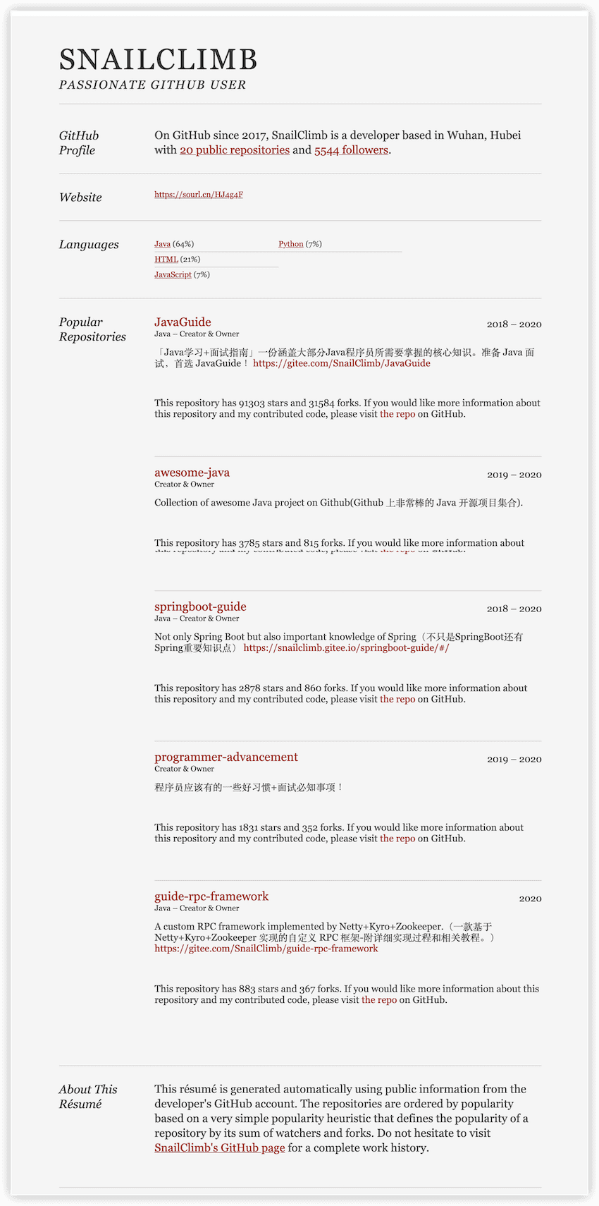 但是,如果你的 Github 没有什么项目的话还是不要放在简历里面了。生成后的效果如下图所示。