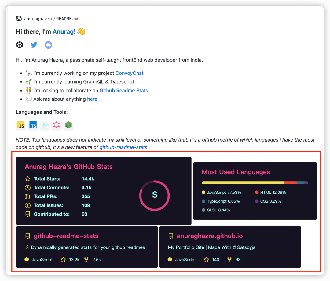 创建一个和你的Github账户同名的仓库这个也是可以玩出花来的!比如说:通过 github-readme-stats 这个开源项目,你可以 README 中展示动态生成的 GitHub 统计信息。展示效果如下图所示。