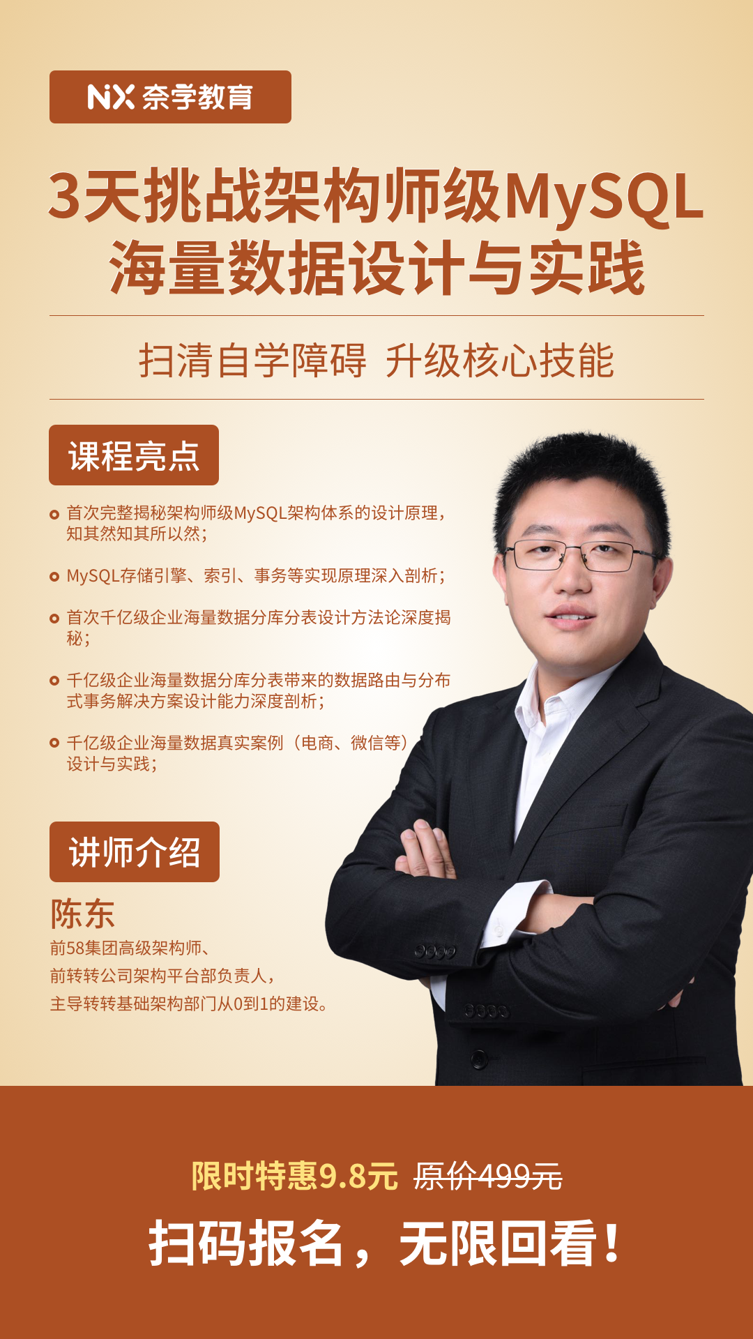 课程原价499,现在花9.8就能拿下,半杯秋天的第一杯奶茶,换来名师精心打磨的千亿级企业MySQL架构师技术实战课,相当划算!11月9日-11日,3天速成,晚20:00-21:30点,绝对是市面上非常高质量的一门MySQL架构设计实践精品课,也是P7架构师必须掌握的核心技能!