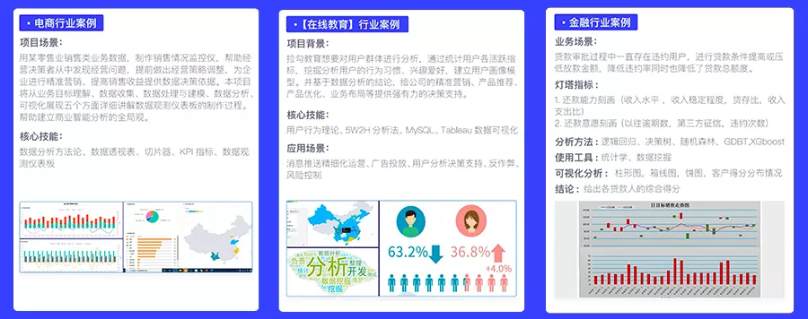 拉勾这门课完全基于大厂实战案例,手把手带你拆解业务,针对不同的⾏业,如在线教育、电商等等,带你以数据分析师的身份深⼊以下实际场景中——