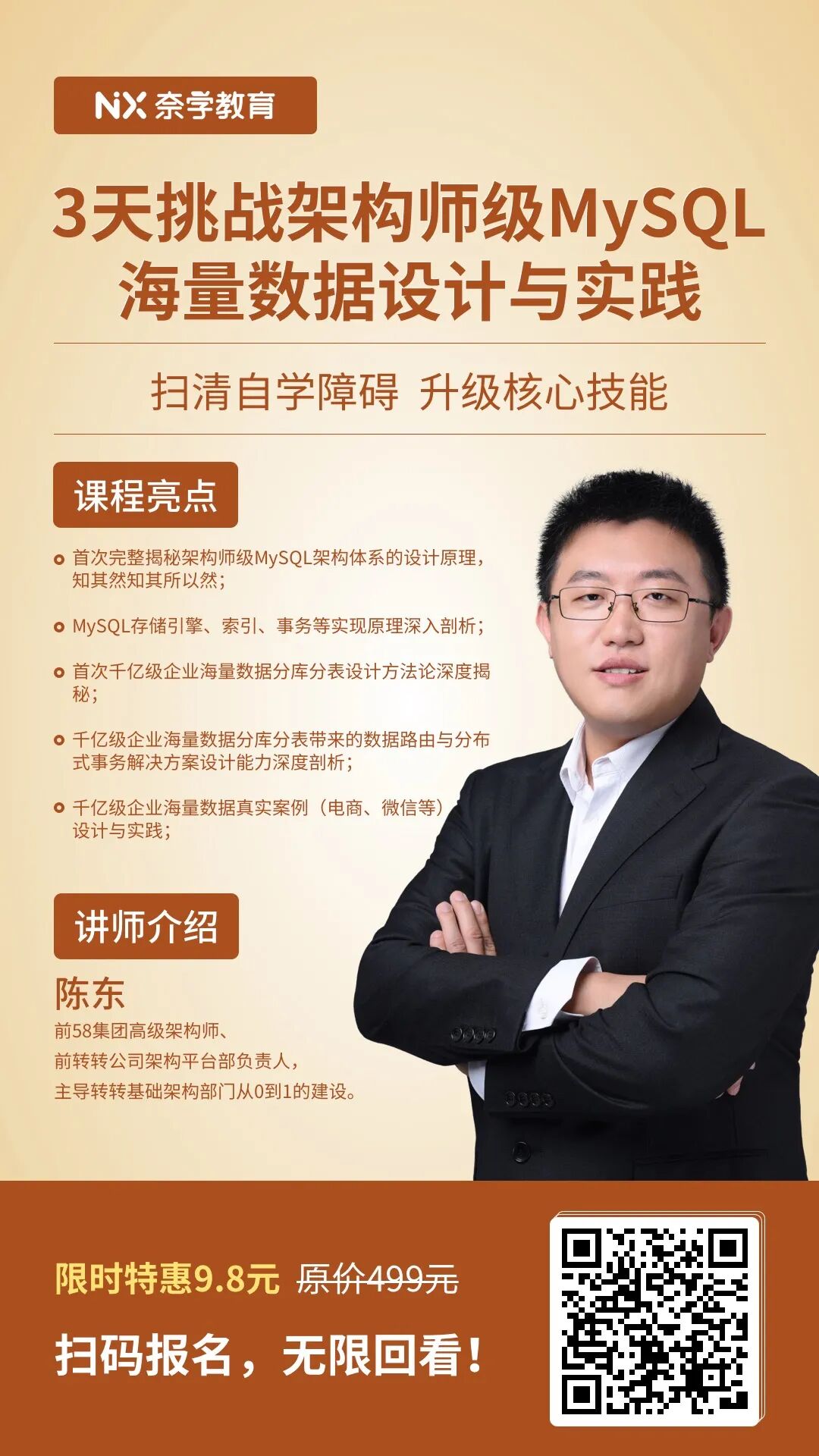 课程原价499,现在花9.8就能拿下,半杯秋天的第一杯奶茶,换来名师精心打磨的千亿级企业MySQL架构师技术实战课,相当划算!11月9日-11日,3天速成,晚20:00-21:30点,绝对是市面上非常高质量的一门MySQL架构设计实践精品课,也是P7架构师必须掌握的核心技能!