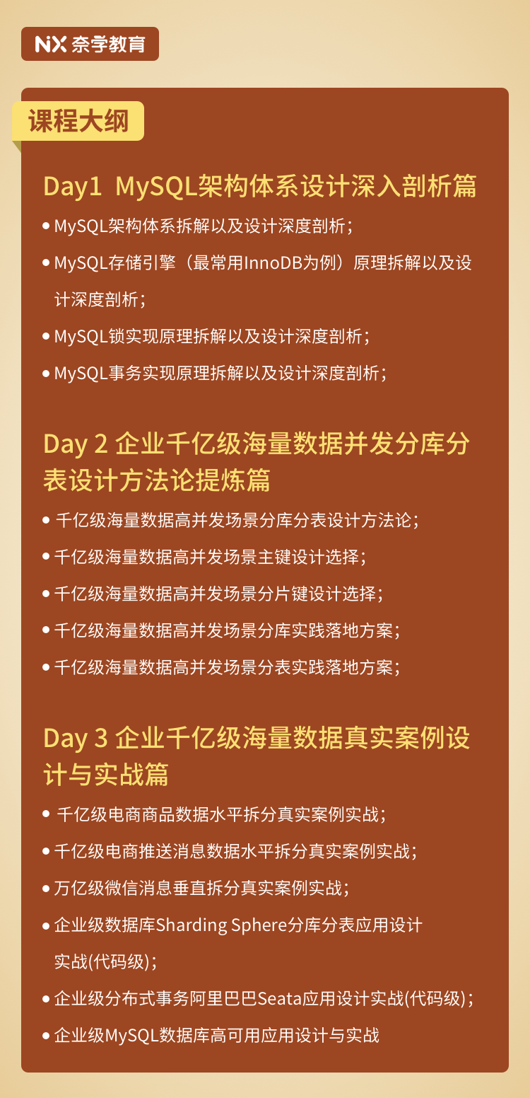精品课程内容由3大篇章15个模块构成,包括MySQL架构设计深入剖析篇、千亿级企业海量数据分库分表方法论提炼篇、千亿级企业海量数据真实案例设计与实践等核心实战内容,通过通俗易懂的企业案例式讲解,带你真正掌握架构师级MySQL海量数据设计与实践,从而在成为优秀架构师的路上越走越快!