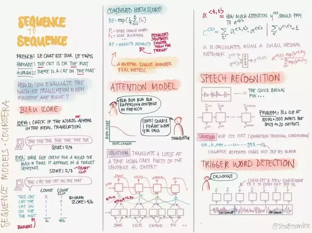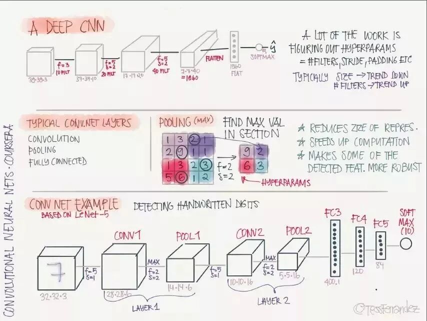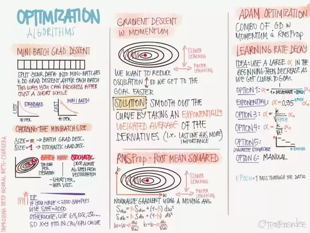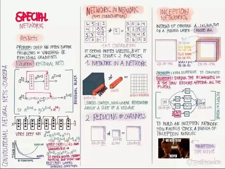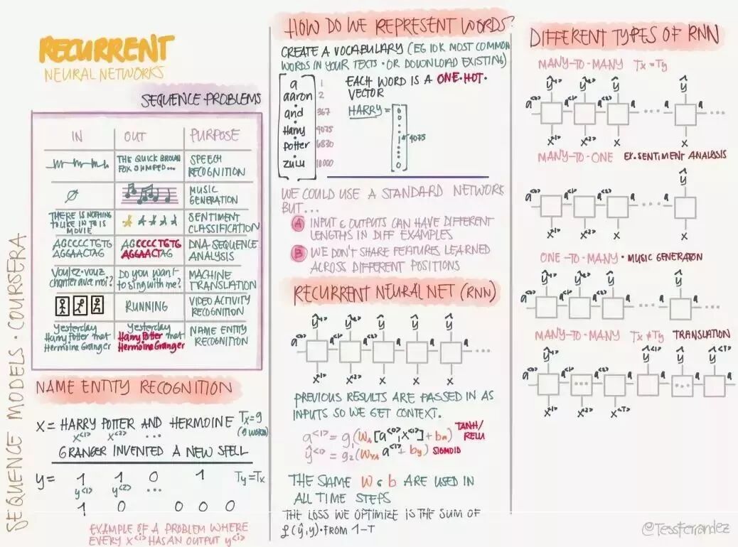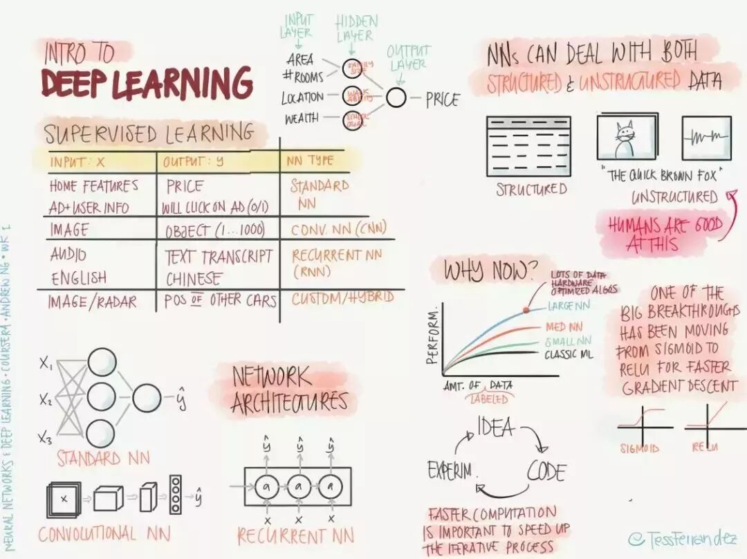 吴恩达在推特上展示了一份由 TessFerrandez 完成的深度学习专项课程信息图,这套信息图优美地记录了深度学习课程的知识与亮点。因此它不仅仅适合初学者了解深度学习,还适合机器学习从业者和研究者复习基本概念。这不仅仅是一份课程笔记,同时还是一套信息图与备忘录。下面,我们将从深度学习基础、卷积网络和循环网络三个方面介绍该笔记。