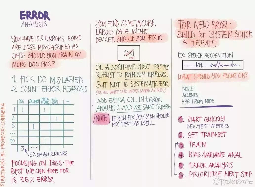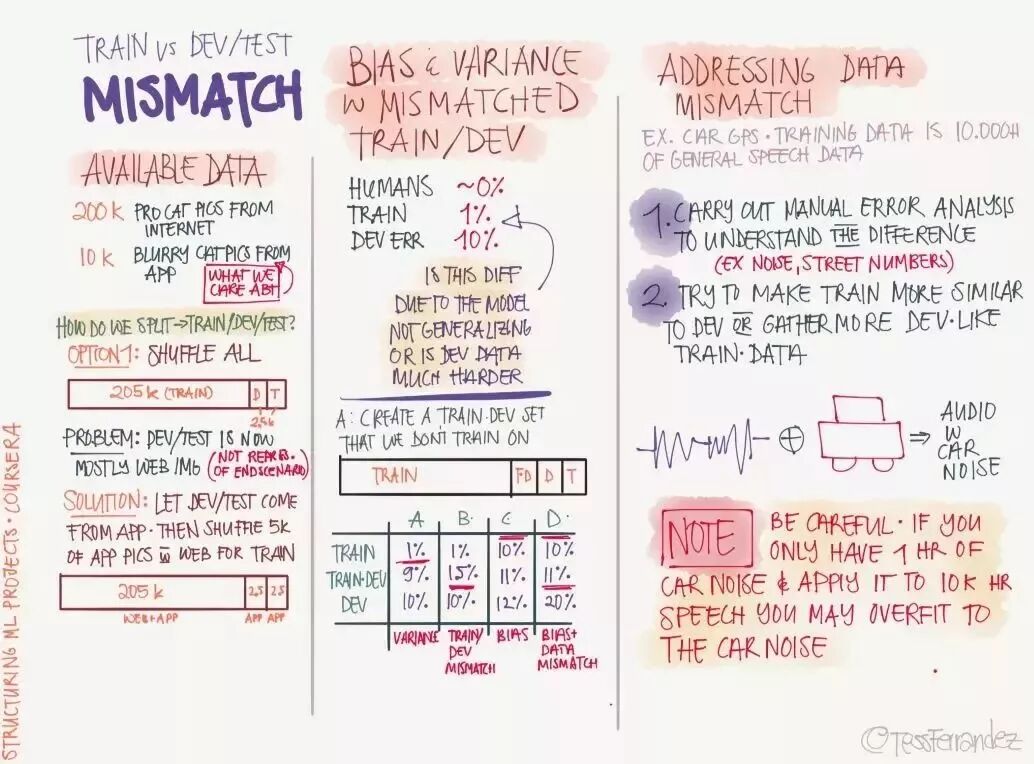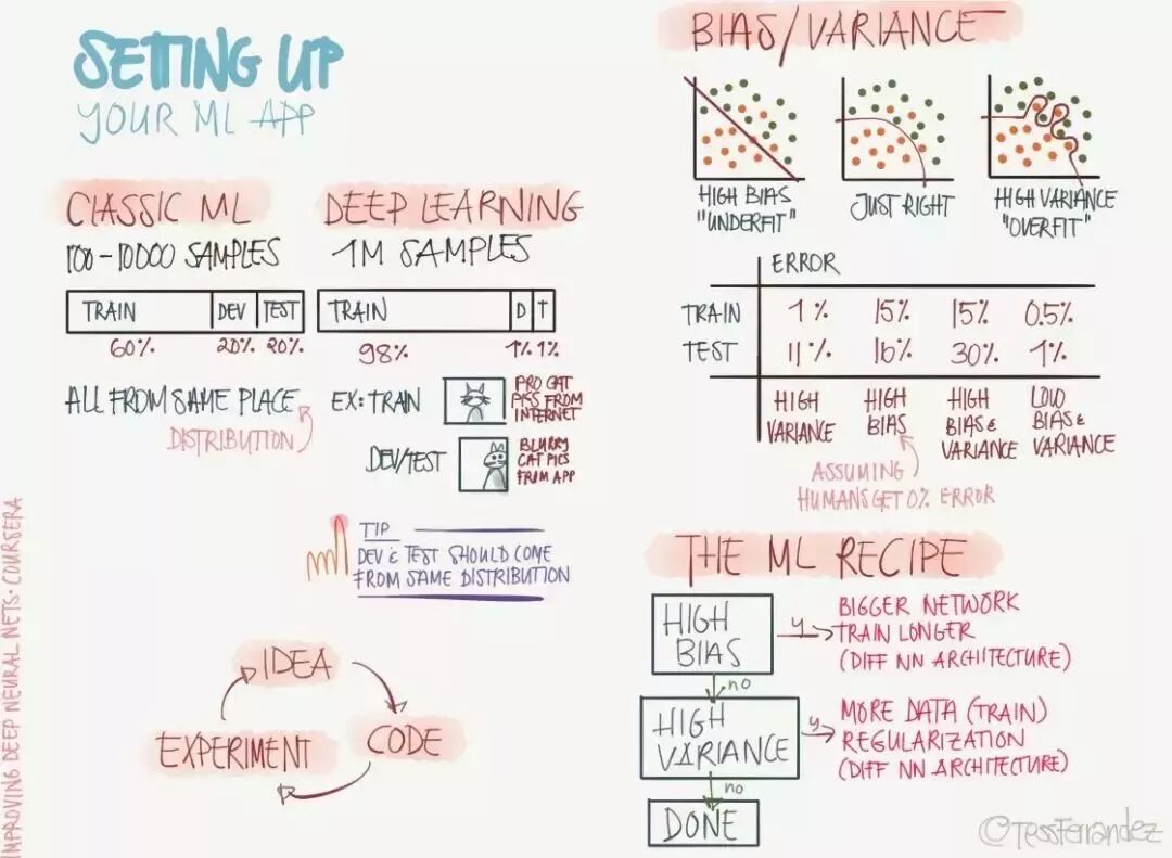 上图展示了三个分割数据集及其表现所需要注意的地方,也就是说如果它们间有不同的正确率,那么我们该如何修正这些「差别」。例如训练集的正确率明显高于验证集与测试集表明模型过拟合,三个数据集的正确率都明显低于可接受水平可能是因为欠拟合。