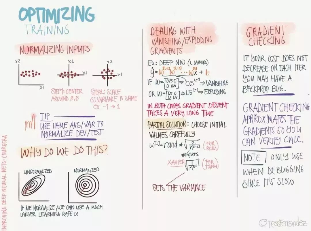 以上展示了最优化常常出现的问题和所需要的操作。首先在执行最优化前,我们需要归一化输入数据,而且开发集与测试集归一化的常数(均值与方差)与训练集是相同的。上图也展示了归一化的原因,因为如果特征之间的量级相差太大,那么损失函数的表面就是一张狭长的椭圆形,而梯度下降或最速下降法会因为「锯齿」现象而很难收敛,因此归一化为圆形有助于减少下降方向的震荡。