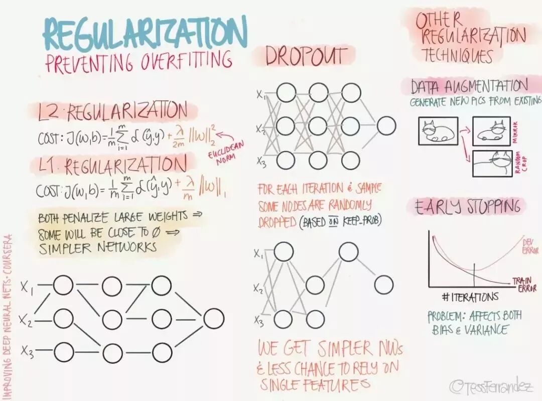 最后,上图还描述了数据增强与提前终止等正则化方法。数据增强通过向训练数据添加转换或扰动来人工增加训练数据集。数据增强技术如水平或垂直翻转图像、裁剪、色彩变换、扩展和旋转通常应用在视觉表象和图像分类中。而提前终止通常用于防止训练中过度表达的模型泛化性能差。如果迭代次数太少,算法容易欠拟合(方差较小,偏差较大),而迭代次数太多,算法容易过拟合(方差较大,偏差较小)。因此,提前终止通过确定迭代次数解决这个问题。