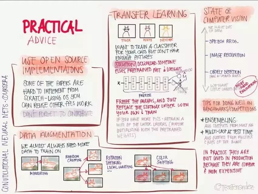 以上是所有关于吴恩达深度学习专项课程的信息图,由于它们包含的信息较多,我们只介绍了一部分,还有很多内容只是简单的一笔带过。所以各位读者最好可以下载该信息图,并在后面的学习过程中慢慢理解与优化。