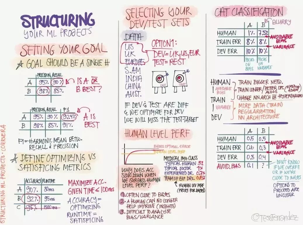 我们需要按过程或结构来设定我们的机器学习系统,首先需要设定模型要达到的目标,例如它的预期性能是多少、度量方法是什么等。然后分割训练、开发和测试集,并预期可能到达的优化水平。随后再构建模型并训练,在开发集和测试集完成验证后就可以用于推断了。