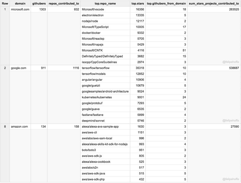 当然,并非所有的项目状况都相同:虽然谷歌比微软贡献的代码库多25%,但这些代码库获得了更多的星数(53万 vs 26万)。 亚马逊软件库 2017 获得 27590 颗星。