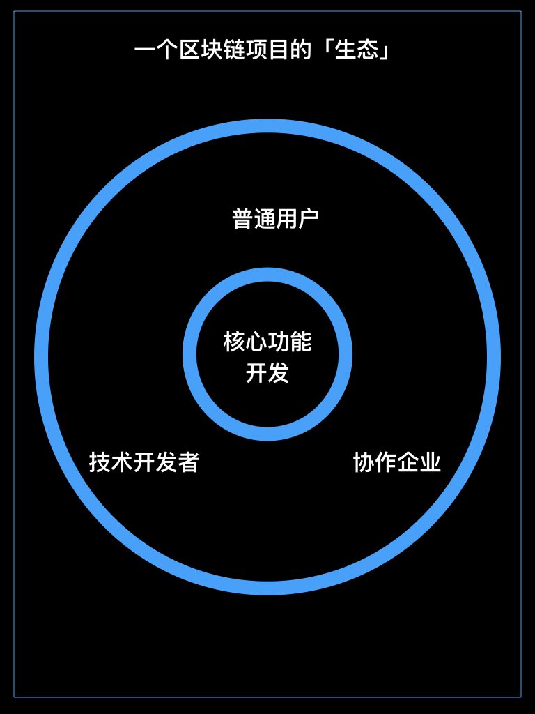 这两类项目有着相似的组成方式、各略有偏重:内圈是围绕区块链技术与经济功能开发,外圈至少包括三方——技术开发者、协作企业以及普通用户。