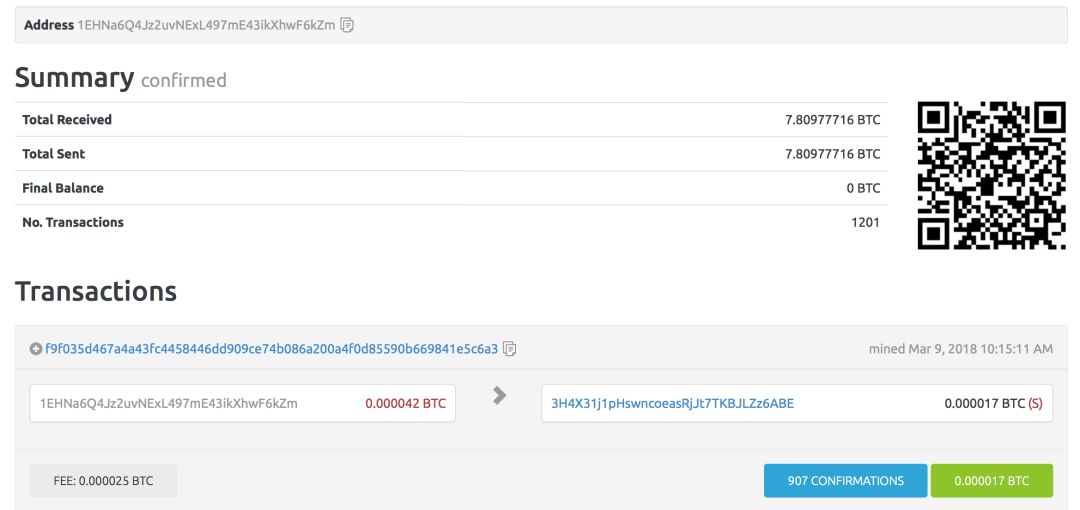 但让我惊讶是,这个地址从2011年到最近的2018年3月9日,居然有过1201笔交易,总共收到过7.8个比特币,即便按照最近跳楼的币价,也是24万块钱人民币呢。这期间任何一个时间点,这个地址里的钱,就是放在大马路上任何人都可随手拿走的钱。多危险呀!