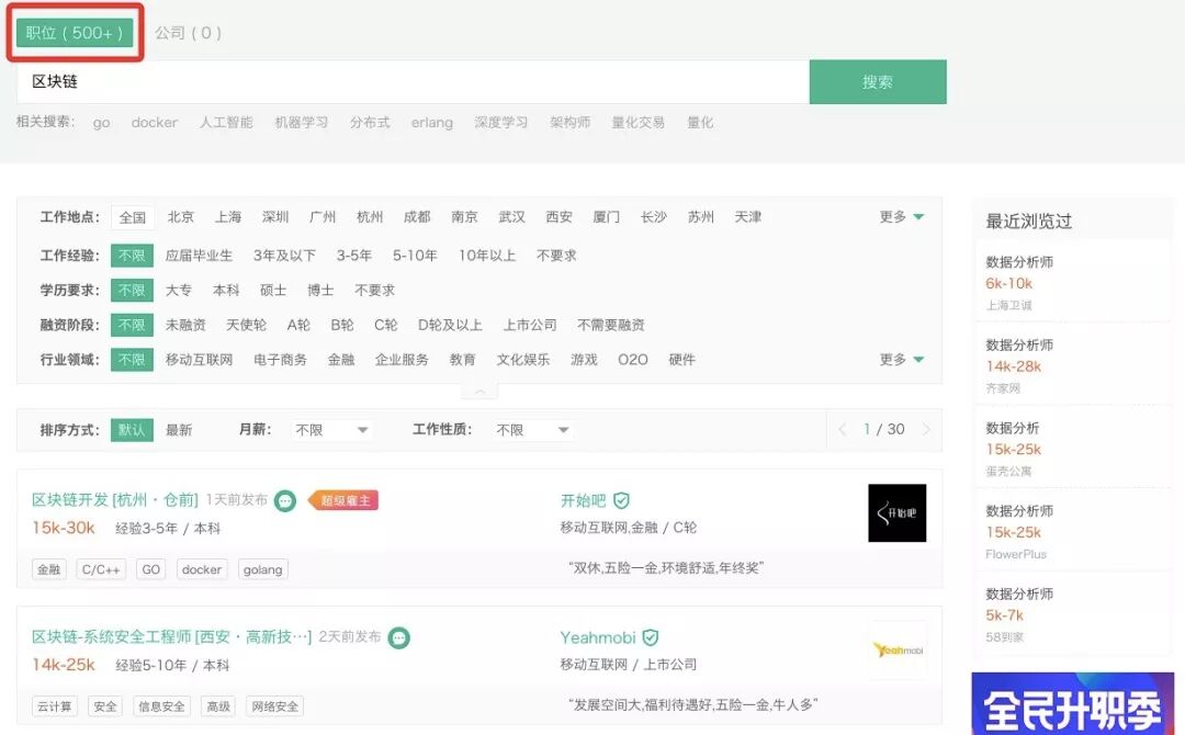 以拉勾网为例,全国站,区块链相关职位约30+页,岗位招聘需求500+个,相关公司热超过50+,热门岗位有区块链工程师、区块链研究员、区块链专家、区块链负责人等,月薪最高可达10万元。