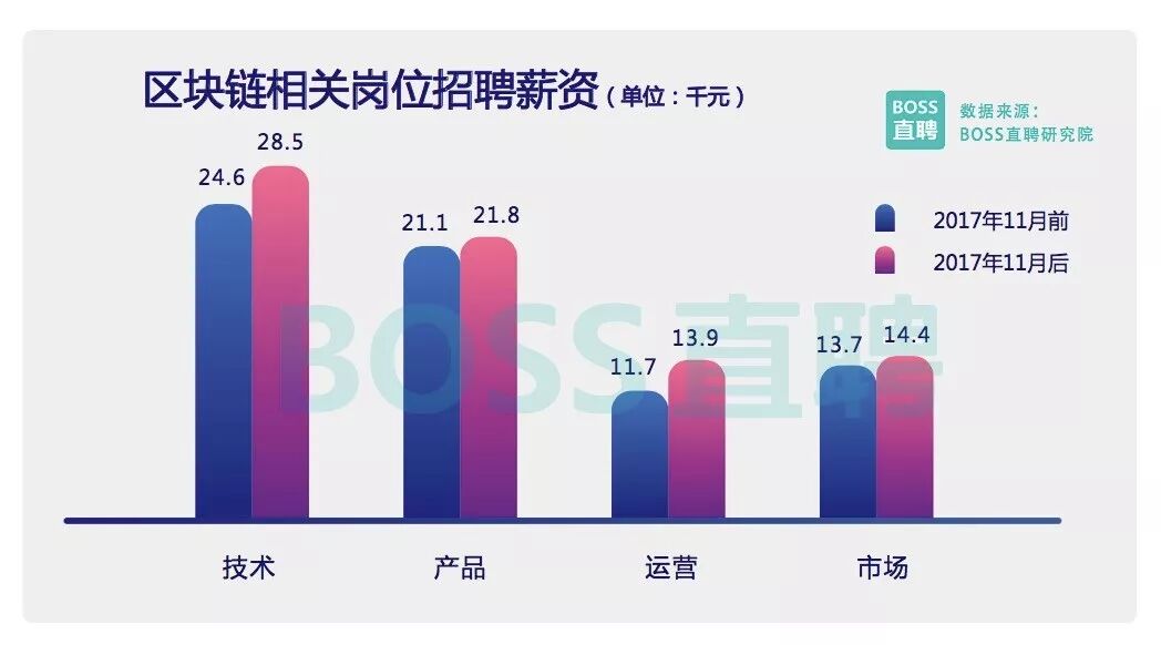 2017年11月之前,区块链相关岗位的平均招聘薪资为2.32万元。2017年11月之后,区块链相关岗位的平均招聘薪资达到2.58万元,其41%的招聘岗位薪资在2万以上。