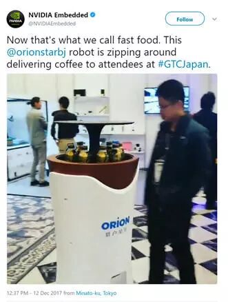 除了微软,猎豹移动还和龙头 英伟达 合作,猎户星空在 2017 年的 NVIDIA GTC (GPU 技术大会)上展出圆柱形滚动机器人,就是采用了 NVIDIA Jetson 人工智能模组。
