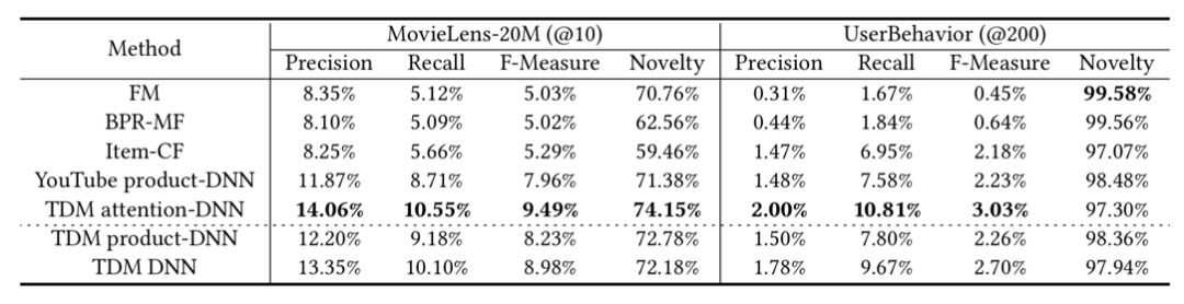我们在公开数据集MovieLens和阿里妈妈构建的广告数据集UserBehavior上进行了TDM的实验对比,评价指标包括精度、召回率、精度召回率调和F1和新颖性等方面,对比的方法包括: