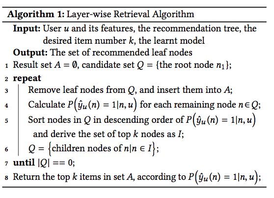 遵循TDM层次检索的原理,我们只需要从根节点出发,自顶向下依次逐层选取该层候选孩子中最优的K个节点即可。也即我们有层次检索算法:对于最终要求K个叶子目标推荐的情况下,选择当前层概率最高的K个节点,然后往下层扩展他们的孩子节点,对下层孩子节点进行概率估计,选取概率最高的K个,递归计算和选取直至所有路径都到达叶子层,最后从候选叶子集合(可能大于2K个)中取概率最高的K个返回即可。具体的检索逻辑可参考图2的伪代码描述。在TDM的实验中,层次TopK的检索被实验证明是有效的,甚至是优于平层暴力(Brute-force)检索的,这一点也侧面验证了兴趣树的层次结构可以有效促进检索的精度提升,具体的提升效果可参见后文实验效果部分。
