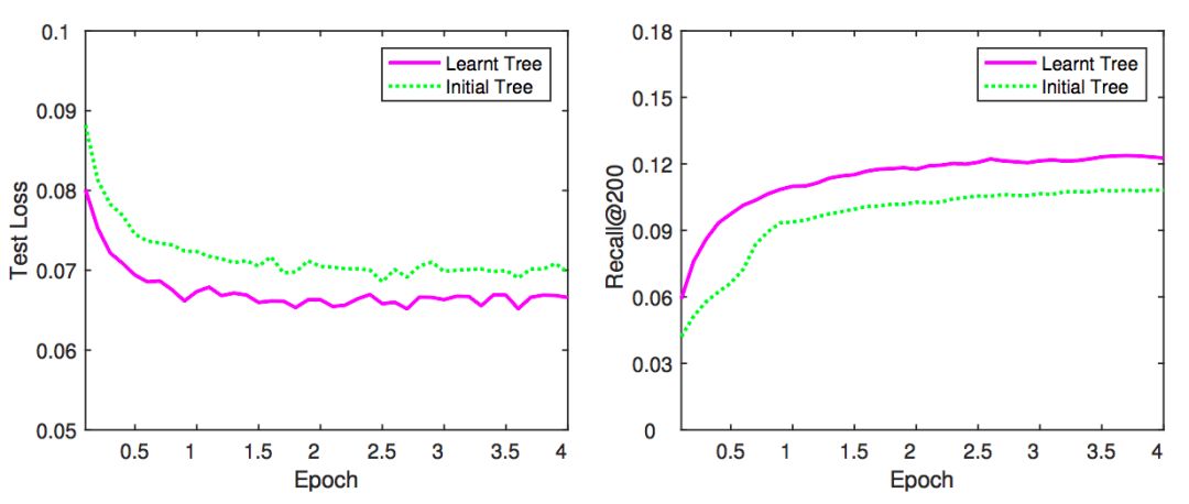 在基础TDM算法框架之上,我们继续创新性地建立了树-模型联合训练框架,通过初始树-模型训练-树重建-模型再训练的循环迭代,树的结构随着模型的演进不断得到优化,使得树更契合用户的兴趣组成和分布,而模型训练也受益于优化后的树结构,进一步降低Loss提升测试效果。联合训练为TDM带来了10%以上的测试效果提升,具体对比可参见后文实验效果部分。