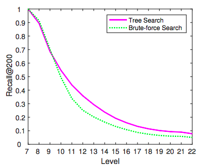我们知道TDM中的树作为检索的载体具有良好的时间复杂性,极大赋能了单点的复杂计算。而树本身就是兴趣层次结构,它将推荐匹配的大问题切割成多个层次化的全局分类小问题递归求解。在实验中我们发现树的这种层次化结构可以更加促进效果的提升。从图4我们可以看到在树层数达到一定高度(9+)后TopK层次检索方法(图2)在召回率上会显著优于在该层上的暴力检索方法。究其原因,我们认为TDM的层次化树检索有效防止了上层差的节点对下层节点序计算的影响,将下层候选圈定在上层好的(TopK)节点的孩子中,相对于暴力检索大大降低了序计算的难度,使其具有更好的分类能力,实现召回效果的提升。