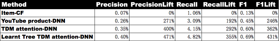 从中可以看到,attention-DNN的TDM方案在全部的指标上都有极大提升,包括相对于广泛使用的Item-CF方案召回率提升292%,相对于业界主流YouTube方案召回率提升34%,而经过树联合训练后Learnt Tree TDM方案效果进一步得到提升,包括相对于广泛使用的Item-CF方案召回率提升355%,相对于业界主流YouTube方案召回率提升56%。指标的提升极大的说明了TDM方案在类目级别的新颖结果上有很好的表现,并从侧面验证了树-模型联合学习对效果的巨大提升。
