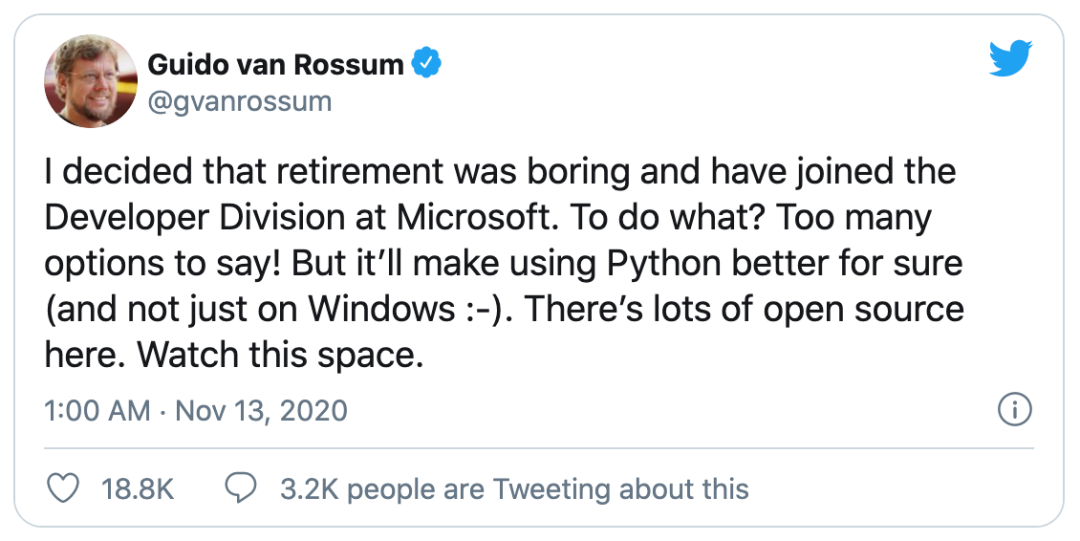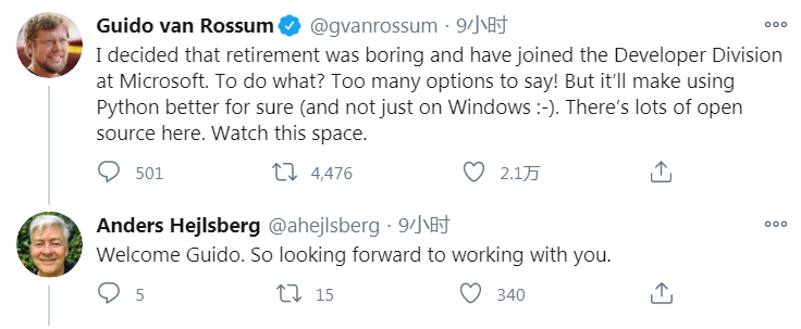 微软发言人对外国科技媒体 Techcrunch 表示,公司没有其他可分享的细节,但证实 Guido van Rossum 确实已加入了微软。