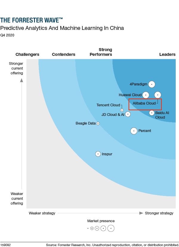 近日,全球权威研究机构Forrester、IDC分别发布《中国预测分析和机器学习Wave,2020Q4》和《Marketscape:中国大数据管理平台厂商评估,2020》报告,阿里云机器学习平台PAI和大数据平台MaxCompute分别位居领导者象限,且在战略维度上双双领先。