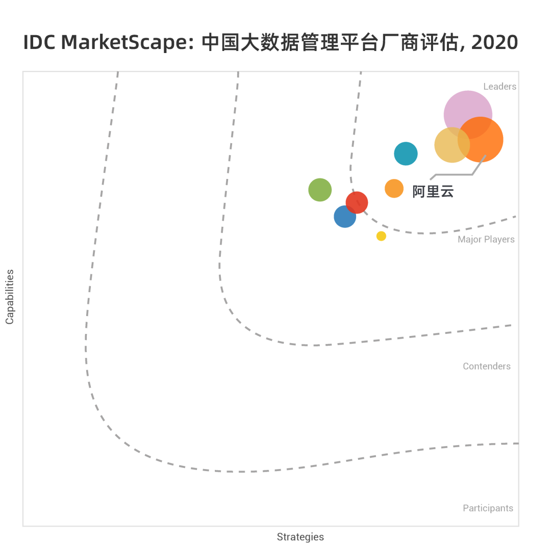 大数据方面,IDC同样给出了较高的评价,在2020中国大数据管理平台厂商评估中。阿里云位列领导者象限,且在战略愿景上领先。