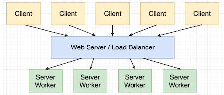 在这种情况下,我们有 5 台客户端,都向应用程序发送请求。这个应用程序的访问入口是一个 Web 服务器,通过将服务分配给一个服务器 worker 池来充当负载均衡器,这些 worker 可以实现为进程、线程或者两者的结合。这些 worker 执行负载均衡器分配给他们的请求。你使用 Web 应用程序框架(例如 Flask 或 Django)编写的应用程序逻辑运行在这些 worker 中。
