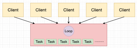 这种类型的服务器运行在单个进程中,通过循环控制。这个循环是一个非常有效率的任务管理器和调度器,创建任务来执行由客户端发送的请求。与长期存在的服务器 worker 不同,异步任务是由循环创建,用来处理某个特定的请求,当那个请求完成时,该任务也会被销毁。任何时候,一台异步服务器都会有上百或上千个活跃的任务,它们都在循环的管理下执行自己的工作。