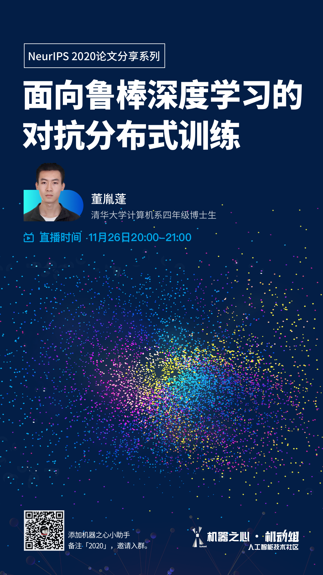 在罗切斯特理工学院就读期间,他的社团活动是「在宿舍黑 iPhone」…… 这是他著名的黑客经历之一。2007 年,17 岁的乔治 · 霍兹成功破解 iPhone 手机,使手机不再局限于 AT&T 网络,而是支持其他 GSM 网络。2009 年,他开发出一款针对 iOS 3.1.2 的越狱软件 blackra1n。2010 年,乔治 · 霍兹宣布不再进行越狱软件的开发。2009 年起,乔治 · 霍兹开始破解 PlayStation 3(PS3)。2010 年初,他宣布得到了 PS3 系统内存的读写权限和处理器的高级控制权。2011 年 3 月,乔治 · 霍兹被索尼起诉,后和解。就工作经历而言,他曾在谷歌、Facebook、SpaceX 工作过。目前,他在自己创立的自动驾驶公司 comma.ai 任职。2015 年,乔治 · 霍兹创立了人工智能创业公司 comma.ai,旨在基于机器学习算法构建自动驾驶技术。乔治 · 霍兹开发出自动驾驶套件 Comma One,只需 1000 美元,用户就能将传统汽车升级成自动驾驶版本。不过,后来这一计划被取消。2020 年,在 CES 大会上,comma.ai 展出了其最新产品——辅助驾驶设备 Comma Two,售价 999 美元。comma.ai 公司还开源了辅助驾驶系统 openpilot,参见:https://github.com/commaai/openpilot。参考链接:https://zh.wikipedia.org/wiki/%E4%B9%94%E6%B2%BB%C2%B7%E9%9C%8D%E5%85%B9https://en.m.wikipedia.org/wiki/George_HotzNeurIPS 2020线上分享:面向鲁棒深度学习的对抗分布式训练论文:《Adversarial Distributional Training for Robust Deep Learning》。本篇论文中,研究者提出了一种名为对抗分布式训练(adversarial distributional training, ADT)的新型框架。11月26日,清华大学计算机系博士生董胤蓬,为大家详细解读此前沿研究。