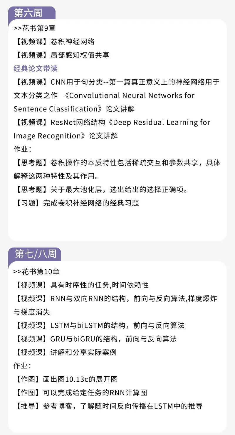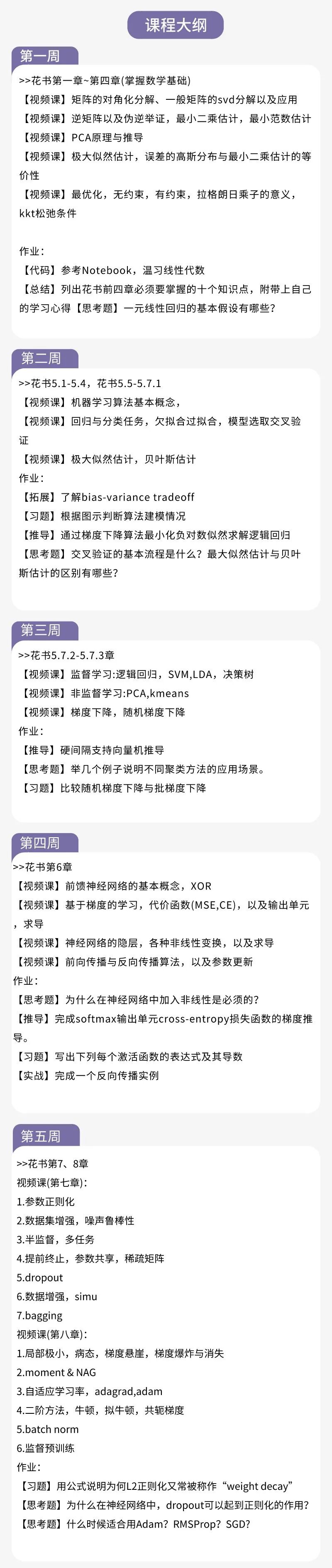一本花书,500多页,全部啃下来非常的难,因此我们进行了重新的梳理,并进行了顺序重组,精心安排了每天详细的教学计划和任务,对2个月进行整体规划,每日任务布置+打卡监督+每阶段作业讲解!