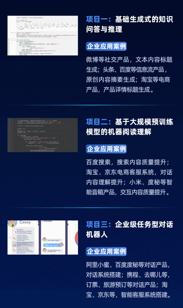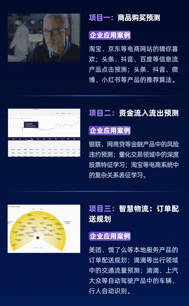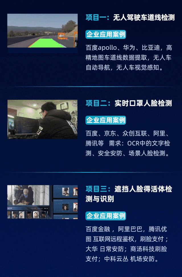 精选3大企业实训项目,都是最前沿的项目,其中不乏产业界没有解决的课题,有很大的优化空间。资深工程师团队专门研究项目,挖掘最优的解决方案。每个项目需要8周时间完成并且落地,培养学员解决问题的能力和创新能力。