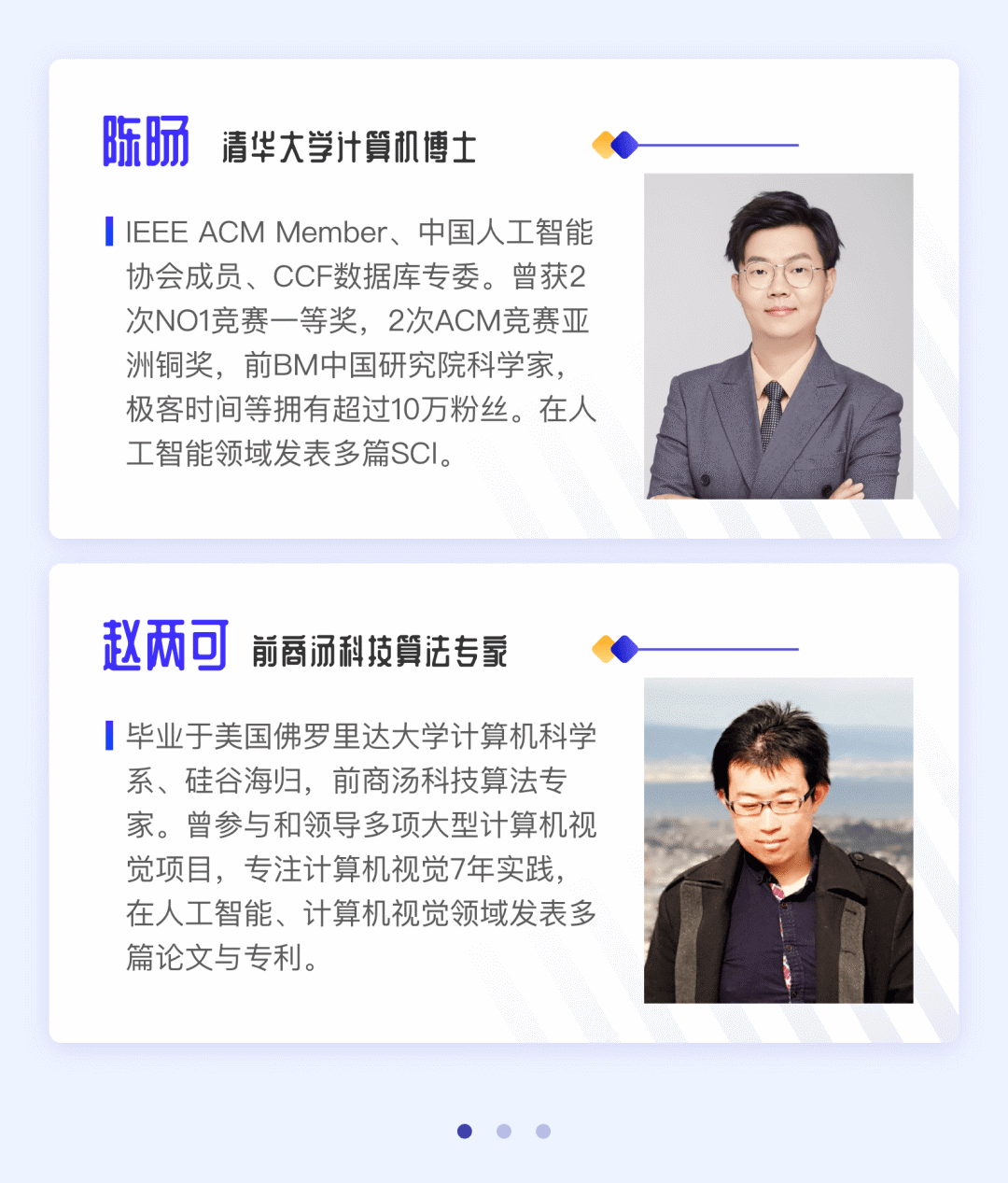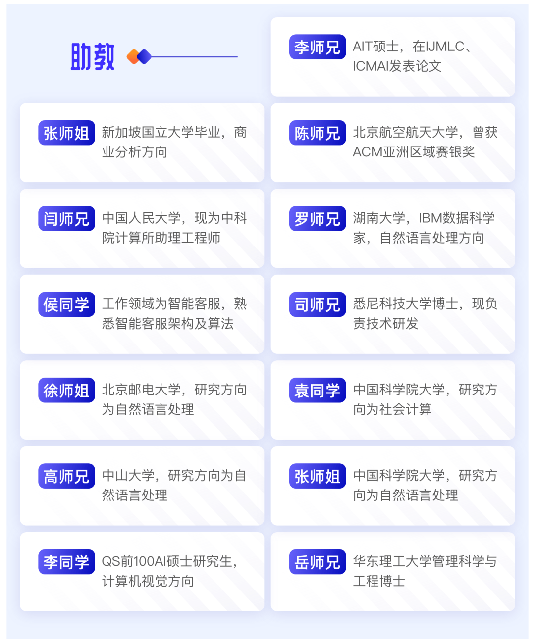 我们的导师均来自于一线名企大厂、资深技术工程师,并具备世界知名企业(阿里巴巴、商汤科技、IBM中国实验室等)的实际工作经验。(以下为部分导师)