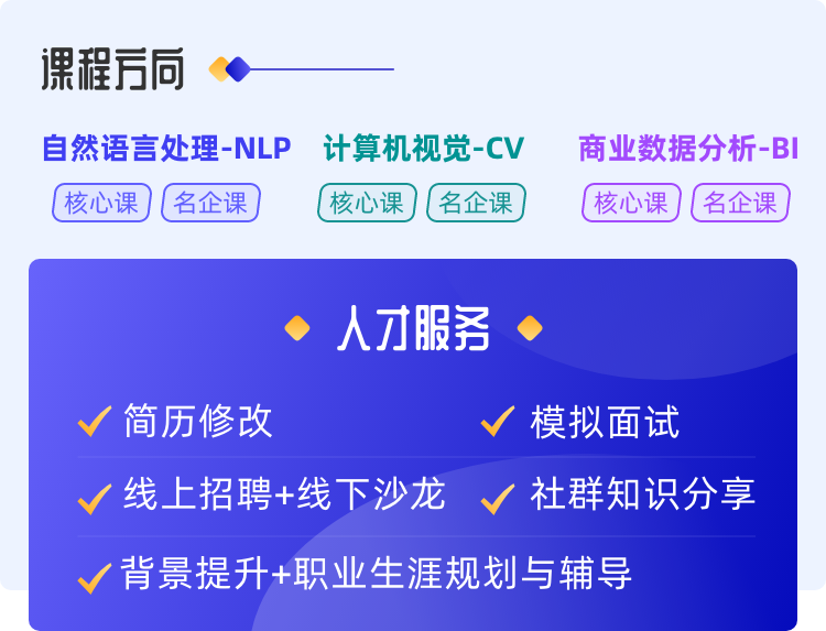 包含人工智能与机器学习、商业智能(BI)、自然语言处理(NLP)、计算机视觉(CV)、Python全栈5个大类。