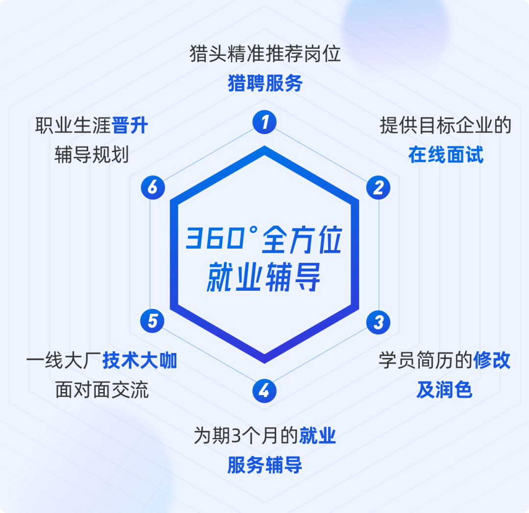 除了课程学习和项目训练,我们也将会提供360°全方位的就业辅导,就业管家帮助学员提升求职竞争力。