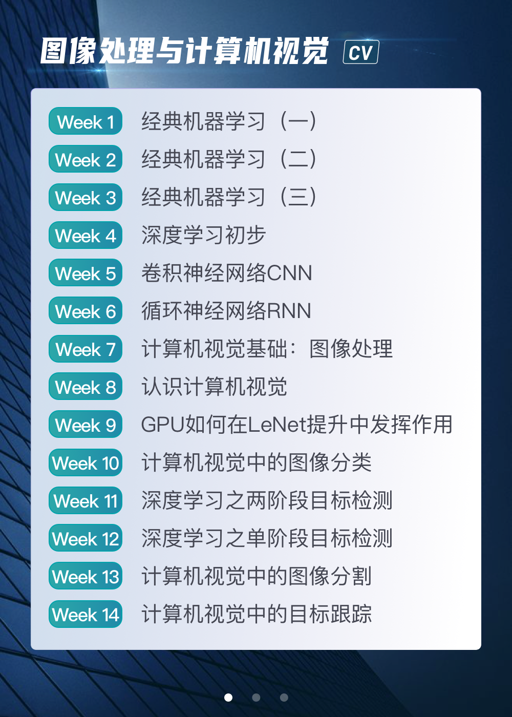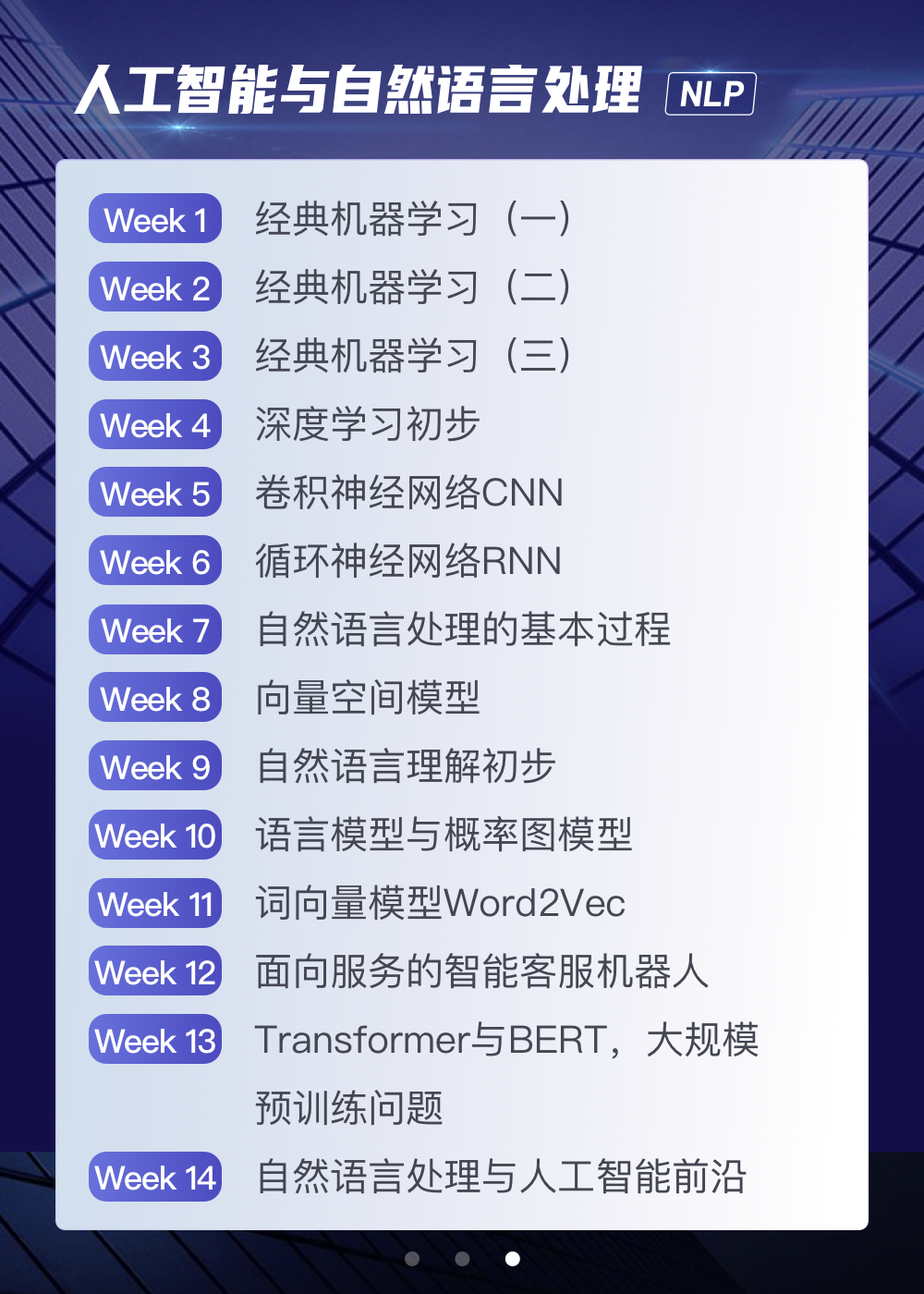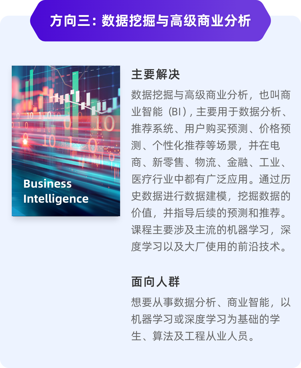 课程分为自然语言处理与文本挖掘、图像处理与计算机视觉、数据挖掘与高级商业分析。本课程由相关领域的资深专家深度参与,讲解这3个方向的技术与原理要点,课程难度对标一流大学研究生课程,能够帮助同学们在4-6个月内达到能够解决企业常见问题、理解重要原理的水平。
