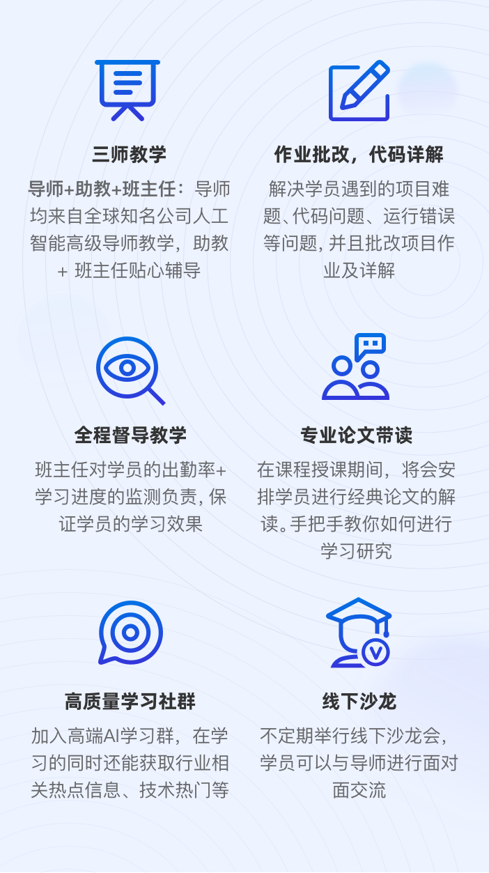 为满足学员不同基础,不同目标,我们为每位学员配备了不同层次的人工智能专业选修课及全院公开课。选修课具有与正价课同样的质量,凡购买正价课的同学,均可免费选修。